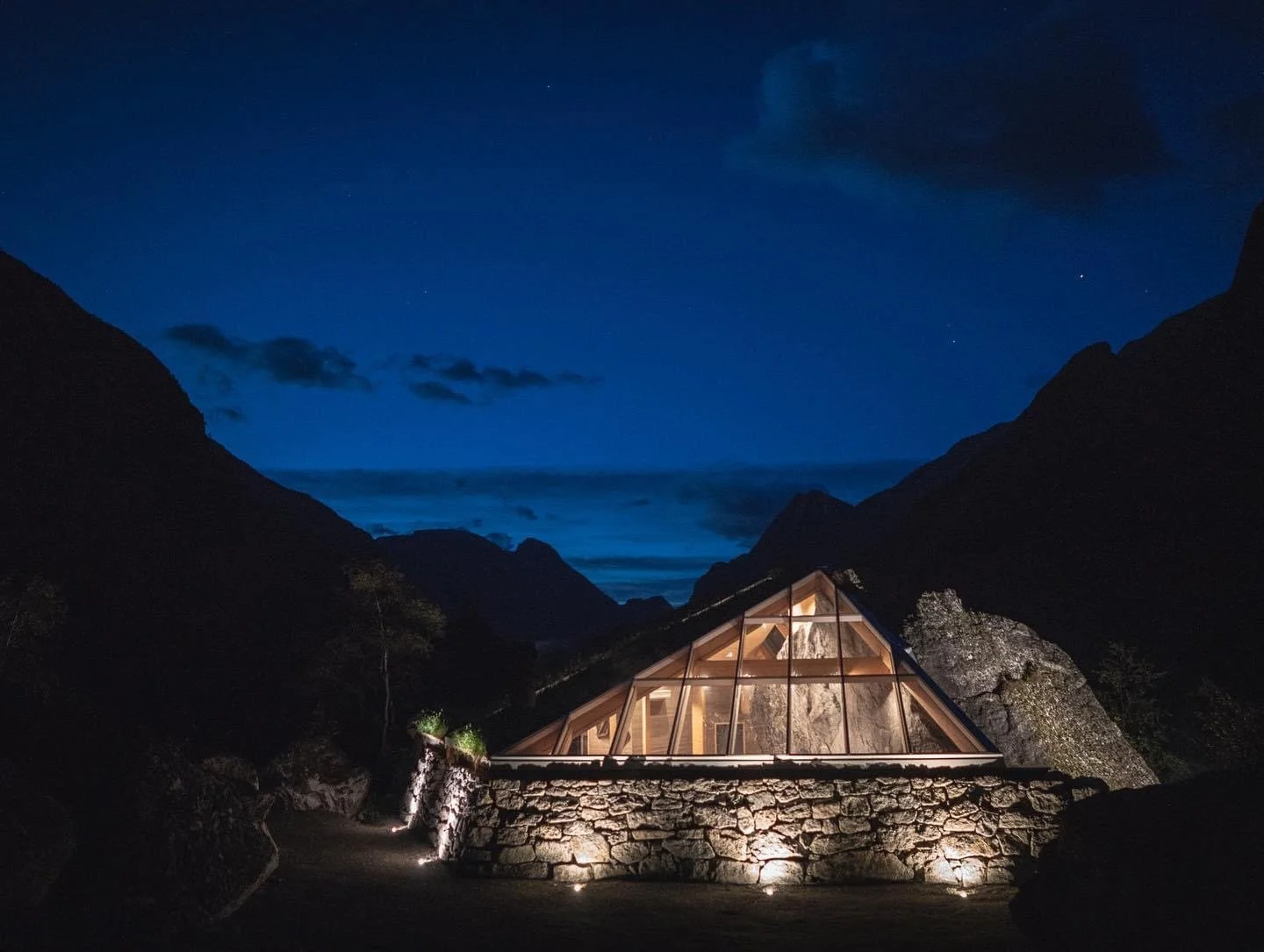 At one of the viewpoints and with one of the biggest boulders serving as the main wall, Inge Melkevoll created this unique indoor space made of stone, wood and glass, with views of the glacier, the mountains and a huge waterfall.