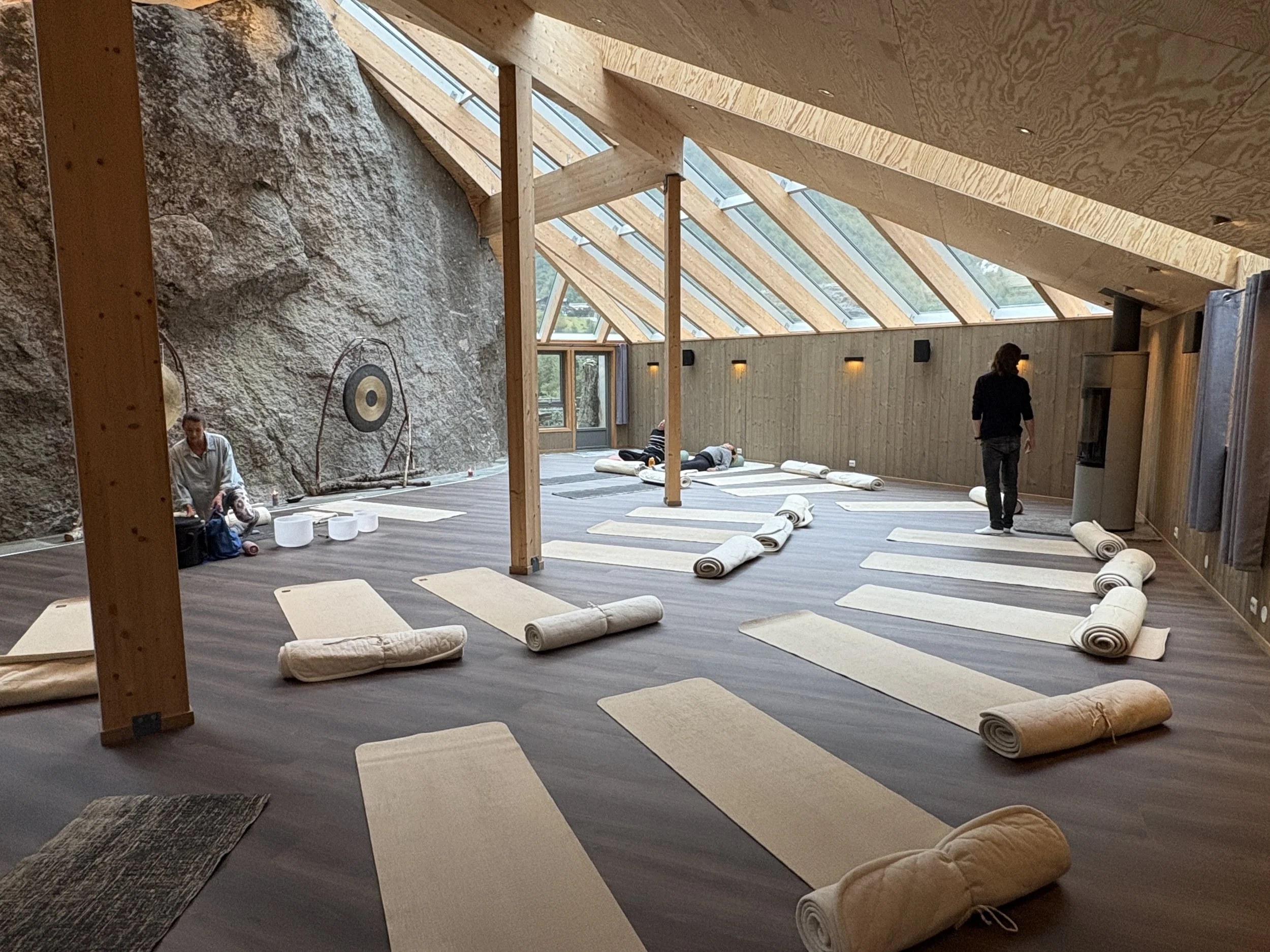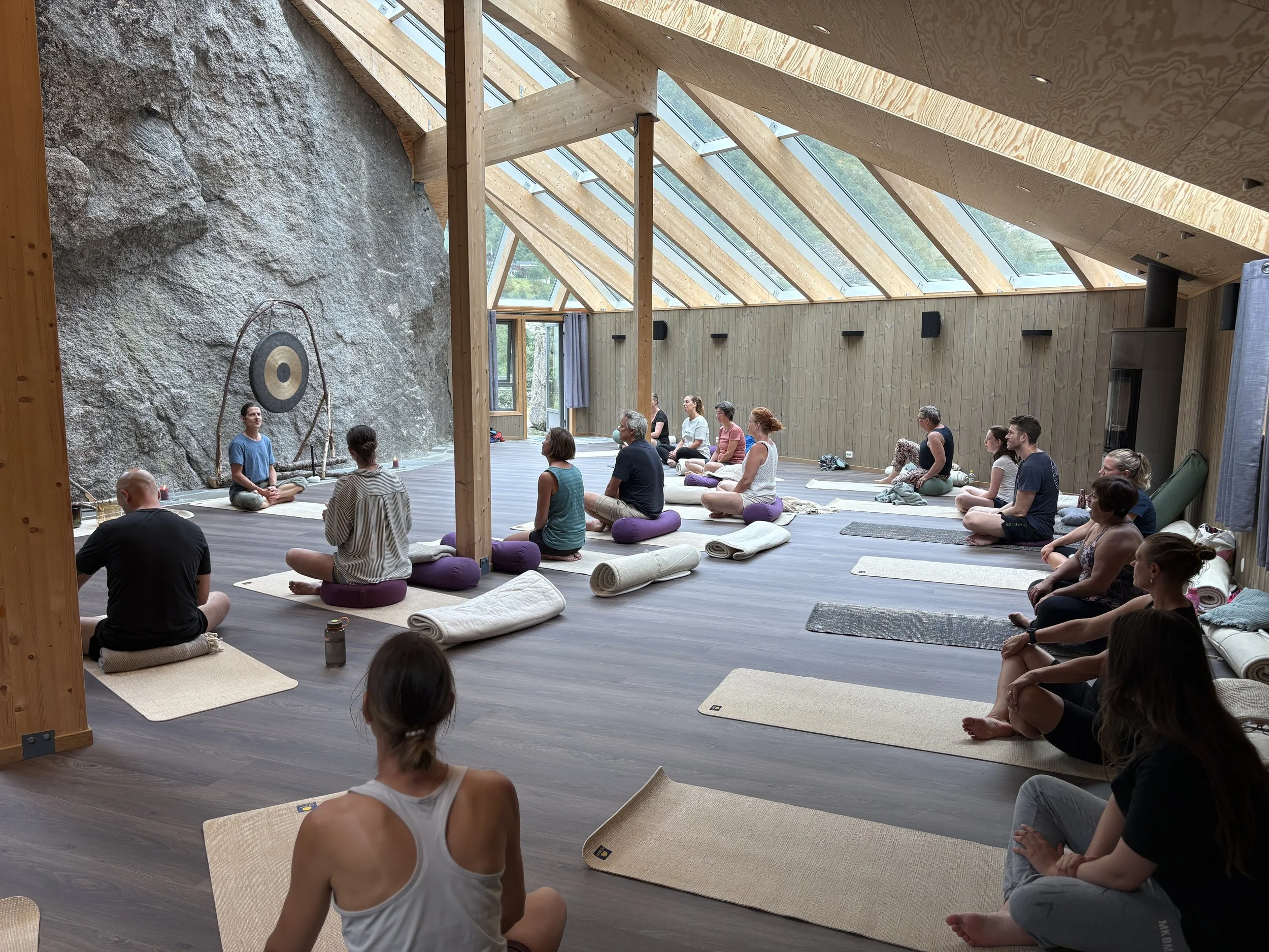The yoga practice we share is inspired by vinyasa style breath movement, as well as classical yoga tools with yoga positions, breathing techniques, and relaxation. The classes are suitable for beginners as well as experienced practitioners. We often include sound and tones from the gong in the end of class, or just silence from nature.